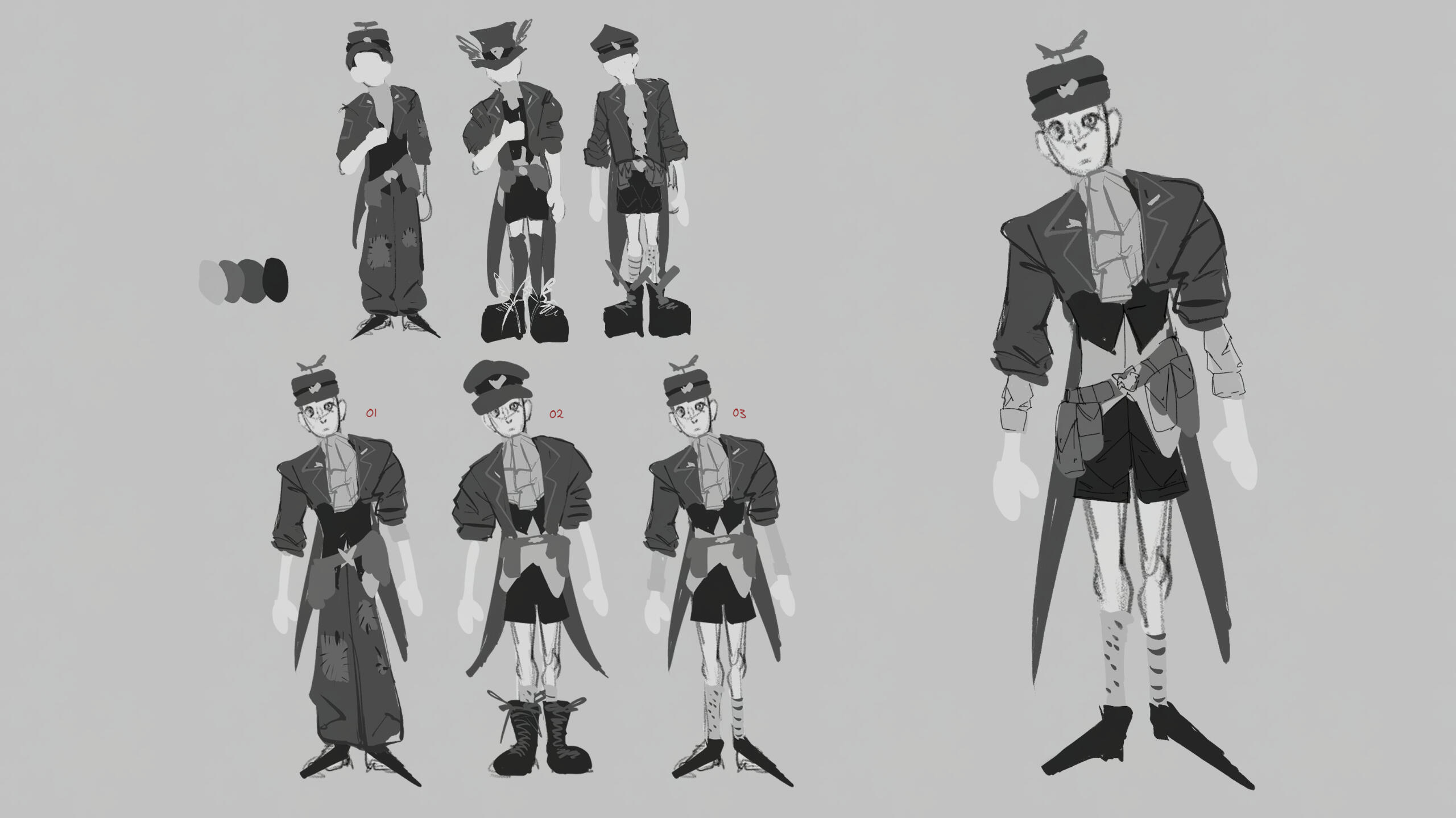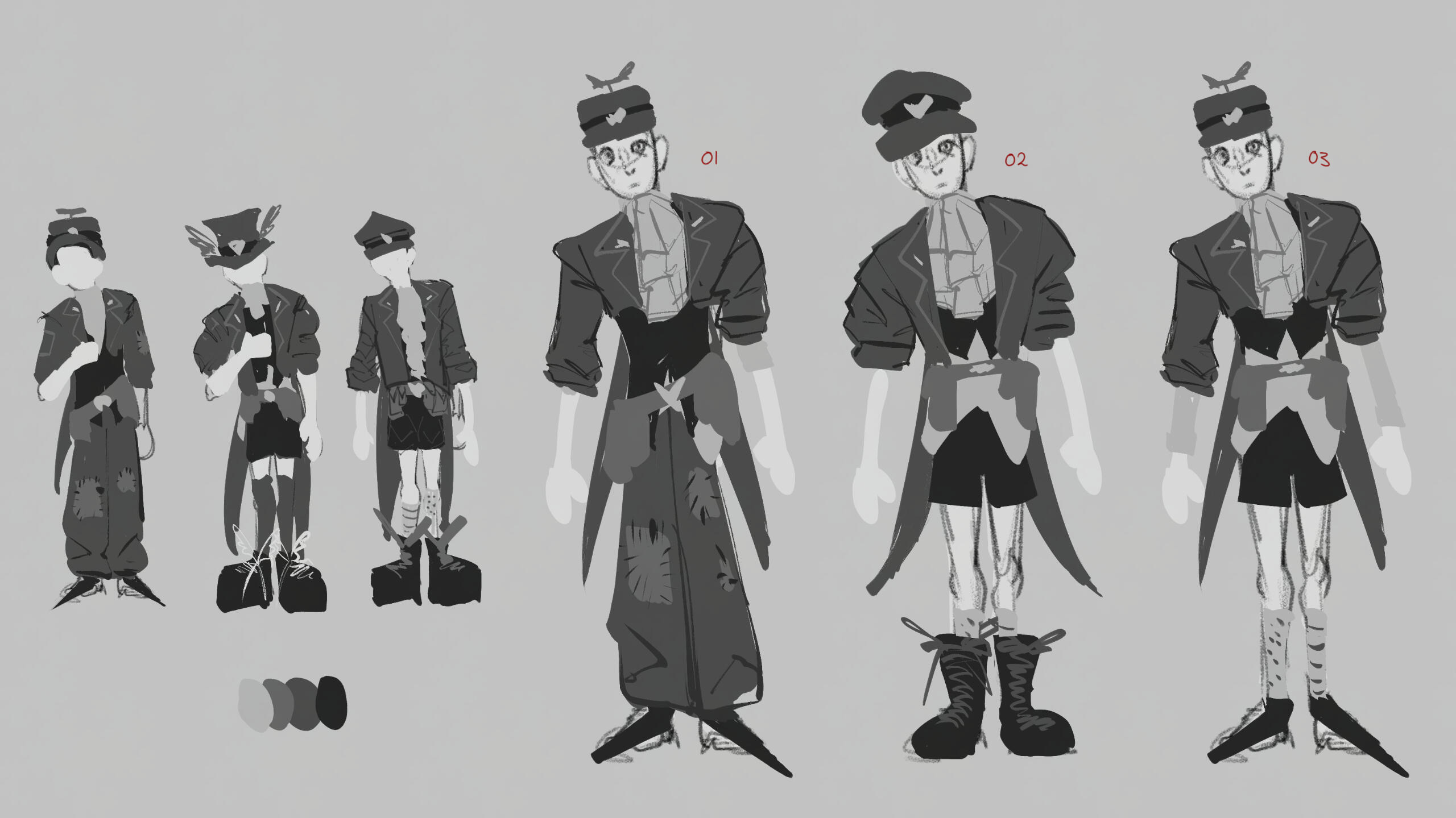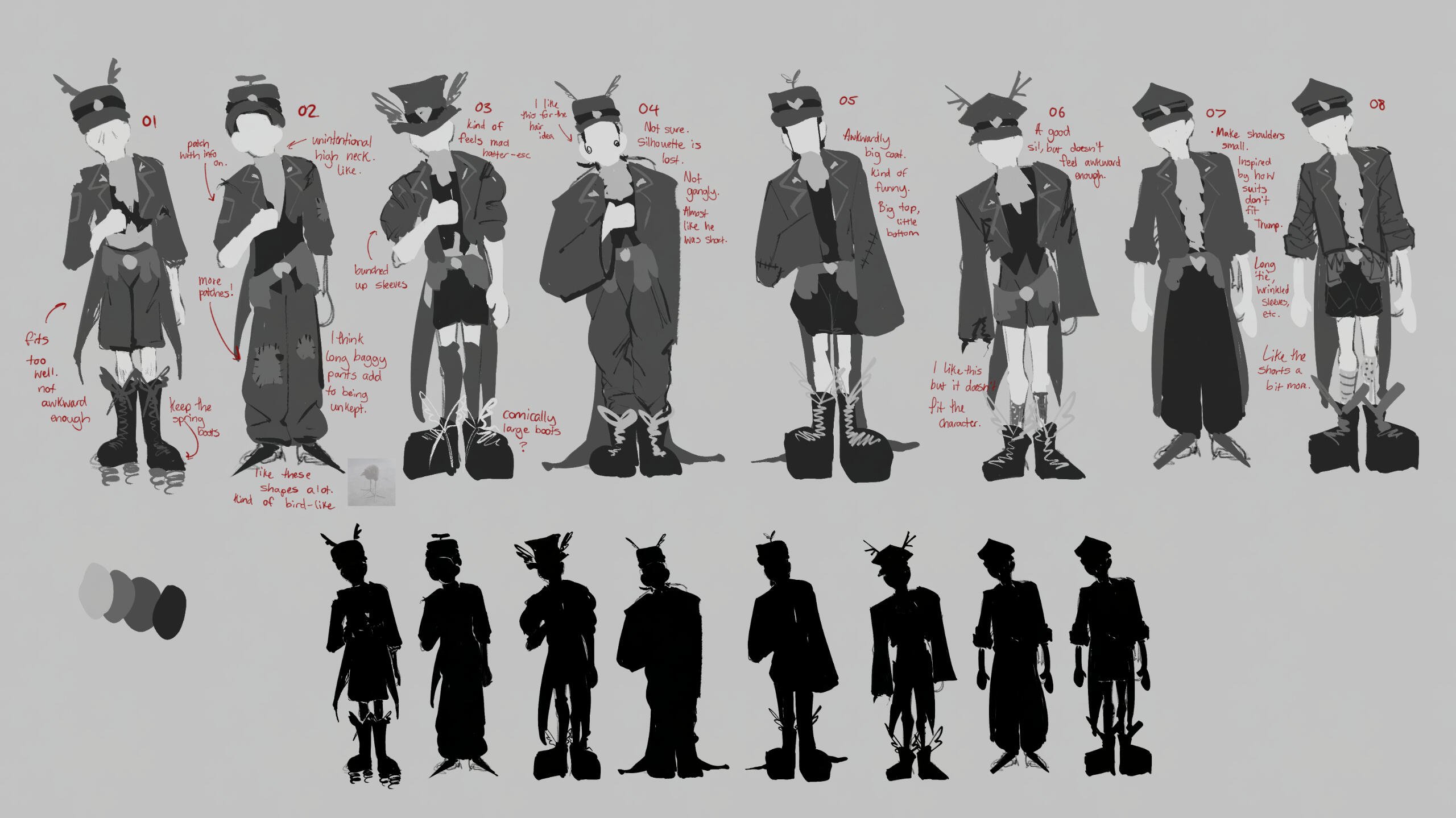 Although not my first time doing ideation, this was my first time doing ideation this detailed. The process of playing with different silhouettes and then further experimenting with them was extremely fun. The best thing about this project is that I've also accidentally created many different potential designs for other characters in this universe, since they're so vastly different.
