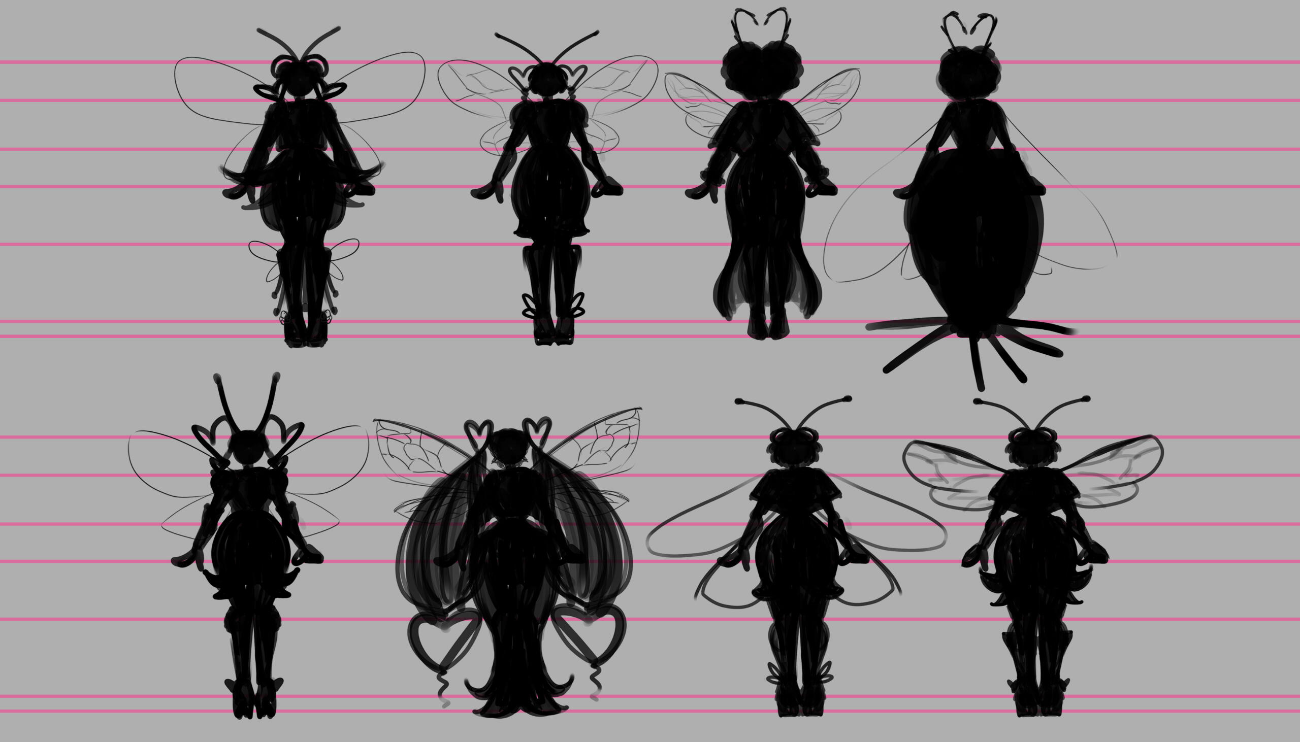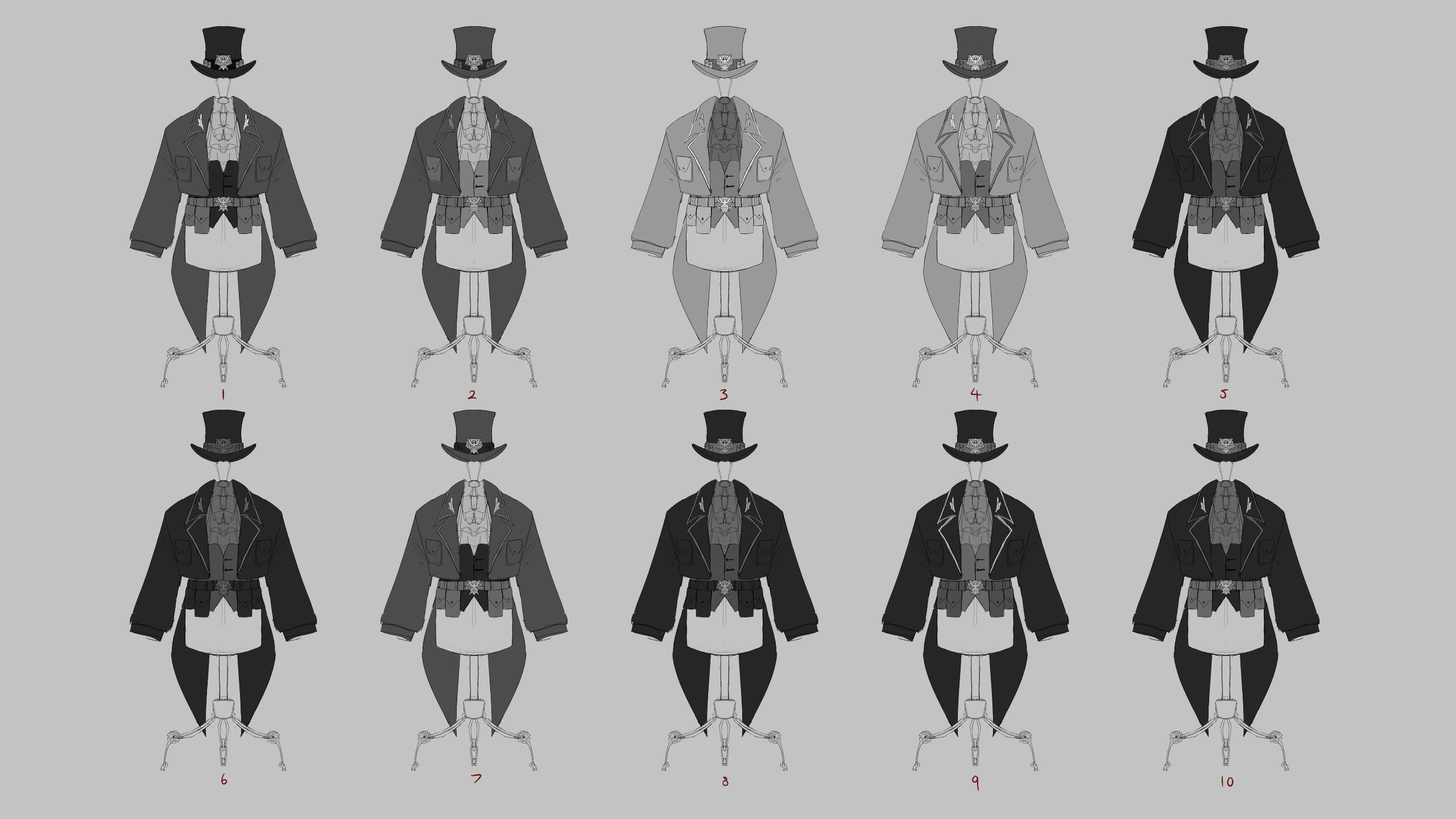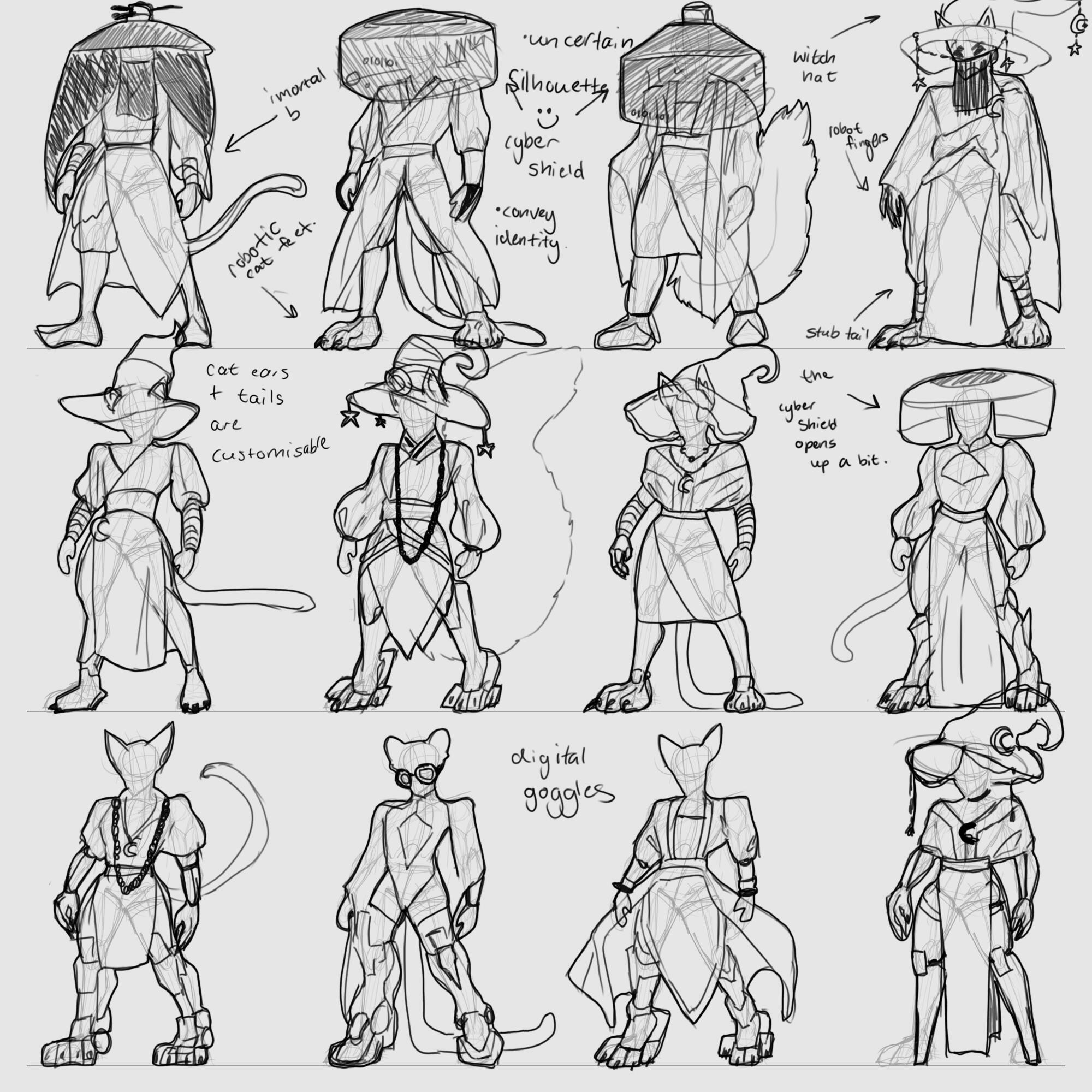 Although not my first time doing ideation, this was my first time doing ideation this detailed. The process of playing with different silhouettes and then further experimenting with them was extremely fun. The best thing about this project is that I've also accidentally created many different potential designs for other characters in this universe, since they're so vastly different.